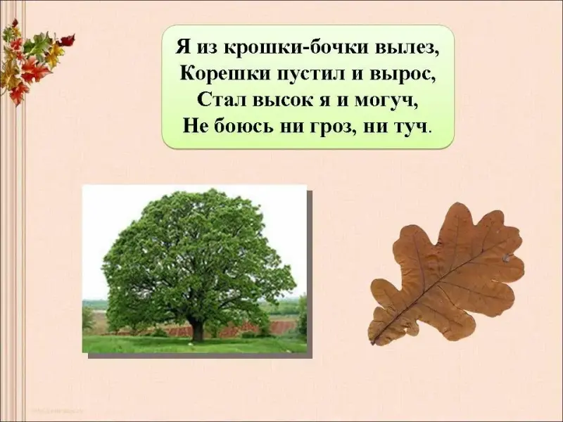 "Красавец" - так переводится латинское, научное название этого дерева. Но оно не только красиво: это дерево - богатырь. Что это за дерево? (Дуб). Покажите его листочки.