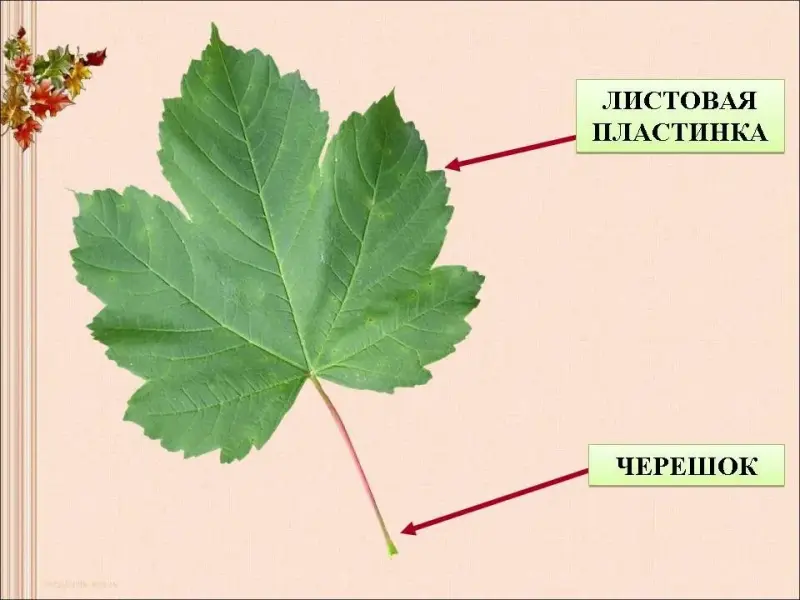 - (Слайд 11) Ребята, посмотрите внимательно на листья, которые лежат на ваших столах. Каждый лист имеет листовую пластинку и черешок. Кто догадался и может показать, что такое "листовая пластинка", что такое "черешок"? (Один из учеников выходит к доске и показывает. Остальные дети выполняют задание на партах)