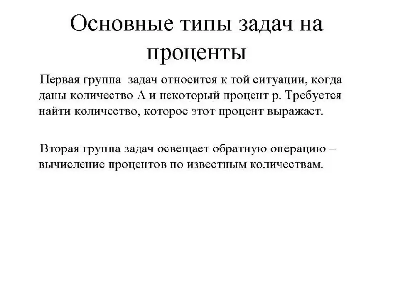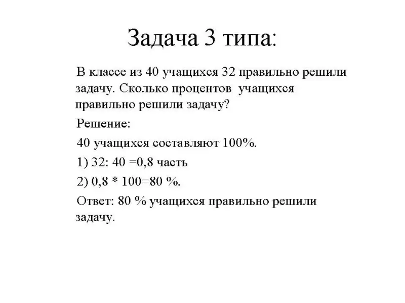 - Вторая группа задач освещает обратную операцию - вычисление процентов по известным количествам.