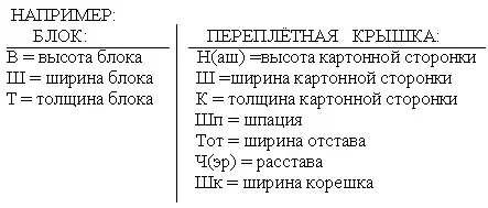 При расчёте деталей переплётной крышки и блока используется определённые условные обозначения: