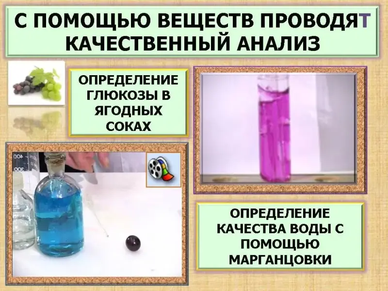 Проведение: Пробирку №1 заполнить "чистой" водой из-под крана, в пробирку №2 - "грязной" (водой с добавлением нескольких капель раствора яичного белка). Прилить в обе пробирки немного раствора KMnO4. В пробирке №1 раствор остается розовым, а в пробирке №2 (в воде с белком) - обесцветится.