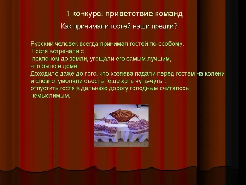 Преподаватель: русский человек всегда принимал гостей по-особому. Гостя встречали с поклоном до земли, угощали его самым лучшим, что было в доме. Доходило даже до того, что хозяева падали перед гостем на колени и слезно умоляли съесть "еще хоть чуть-чуть". отпустить гостя в дальнюю дорогу голодным считалось немыслимым. И сейчас мы услышим, какое приветствие гостям подготовили наши участники викторины, пожалуйста...