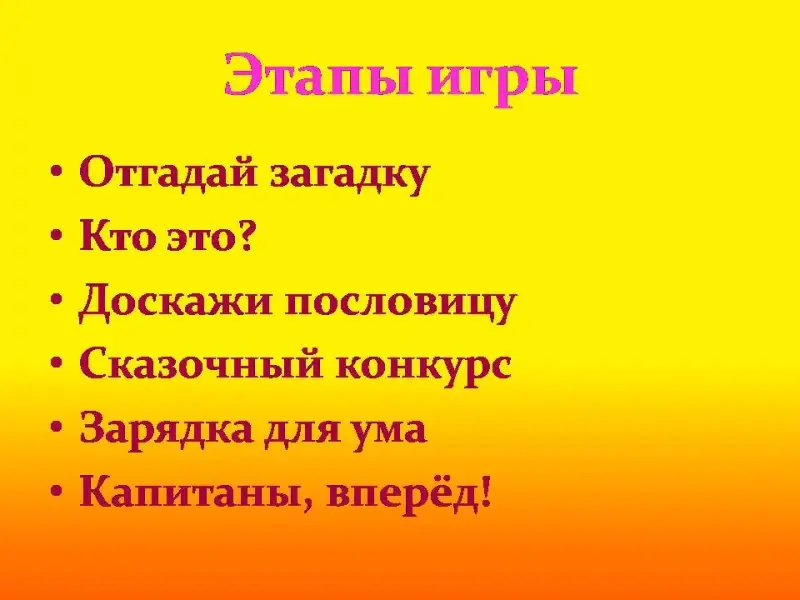 Учитель: Итак, капитаны выбраны, название своей команды вы видите на экране. Осталось ознакомить вас с этапами игры. Наша игра состоит из 6 конкурсов - испытаний. В результате этой игры мы выявим самых усердных и смекалистых ребят.
