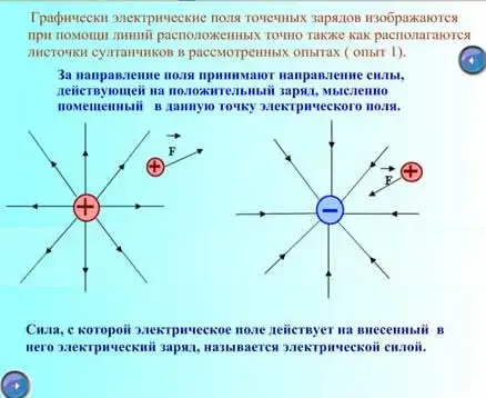 Графически электрические поля точечных зарядов изображаются при помощи линий расположенных точно также как располагаются листочки султанчиков в рассмотренных опытах (возвращается кнопкой на стр.2, опыт 1).