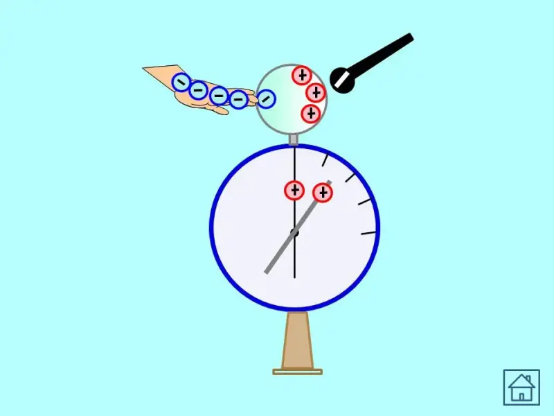 - К электрометру подносят отрицательно заряженную эбонитовую палочку, не касаясь. Стрелка прибора отклоняется, что говорит о наличии заряда на электрометре. Учитель влажным пальцем касается шара электрометра со стороны, противоположной эбонитовой палочке. После того, как убирают заряженную палочку, стрелка остается отклоненной, что показывает присутствие заряда. (Фактически мы зарядили электрометр не касаясь его заряженной палочкой). Как теперь объяснить полученный результат?