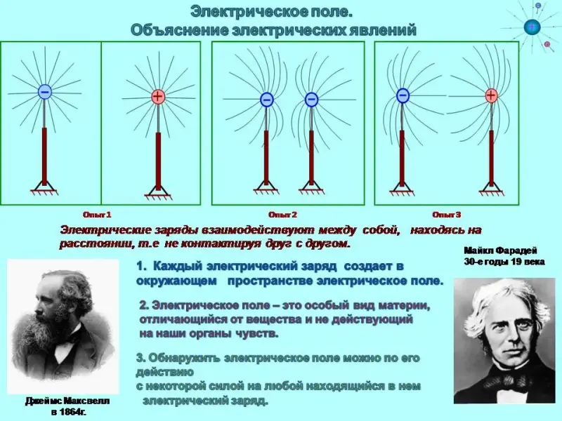 Майкл Фарадей впервые высказал мысль о том, что каждый электрический заряд создает в окружающем пространстве электрическое поле. Поле одного заряда действует на другой заряд и наоборот.