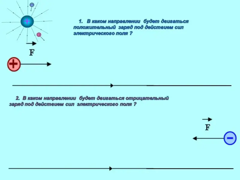Вопрос учителя к классу: Положительный и отрицательный заряды помещены в электрическое поле. Как вы считаете, в каком направлении будут двигаться заряды под действием сил электрического поля?