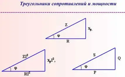 Ранее при рассмотрении векторных диаграмм было установлено, что полное сопротивление цепи Z, реактивное сопротивление хр, активное сопротивление R и сдвиг фаз между током и напряжением φ связаны треугольником сопротивлений (стр. 2) (появляется 1-й треугольник),