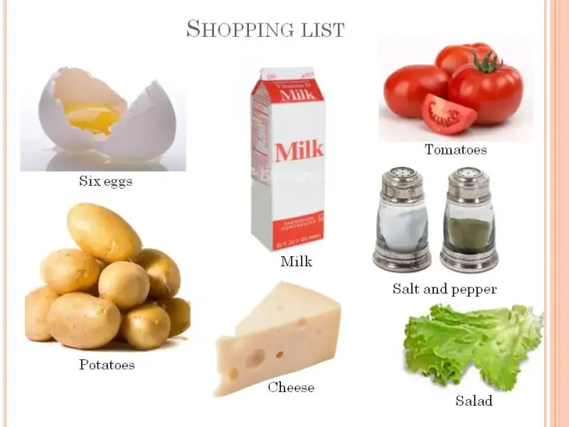 The teacher is going shopping today to buy the things on the list. Let's read the words. Thank you. You know the words on the theme "Food".