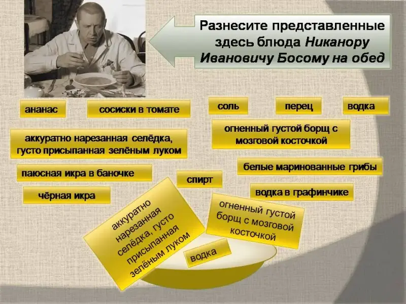 Перед вами стол с яствами. Разнесите представленные здесь блюда трём господам: Никанору Ивановичу Босому на обед, Бегемоту на ужин при камельке, Степе Лиходееву на лечение.