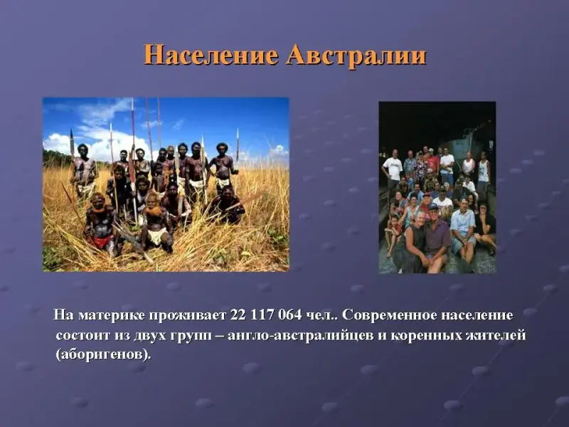 На материке Австралия проживает 22 117 064 чел.. Современное население состоит из двух групп - англо-австралийцев и коренных жителей (аборигенов).