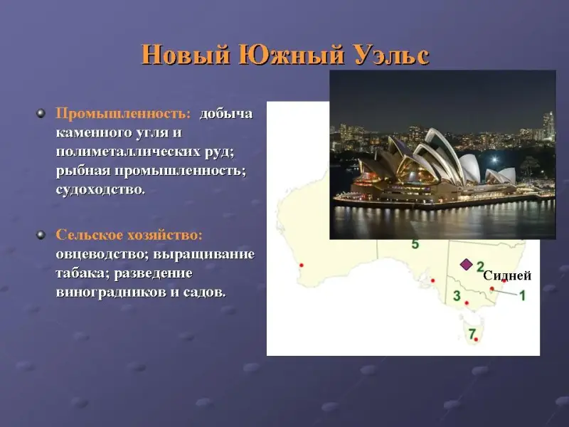 | Новый Южный Уэльс (слайд 12) | Сидней | Добыча каменного угля и полиметаллических руд; рыбный промысел, судоходство | овцеводство | Выращивание табака, пшеницы; виноградники, сады. |