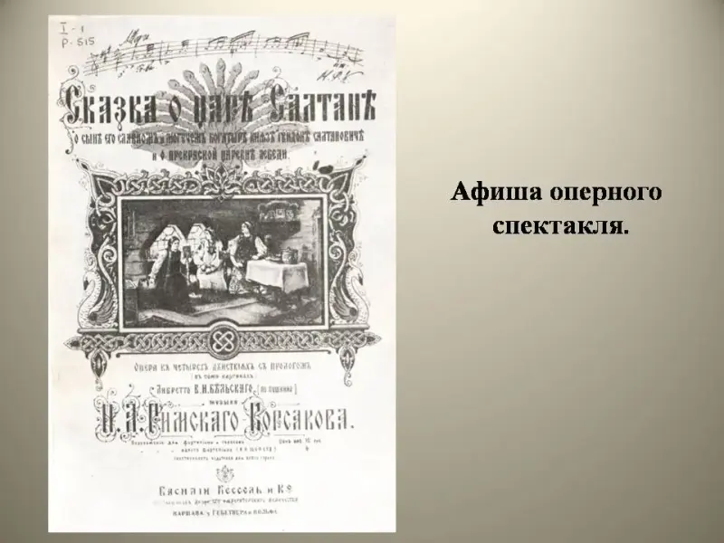Композитор Николай Андреевич Римский-Корсаков написал на этот сказочный сюжет оперу. Его единомышленниками были: С.И. Мамонтов, И. Врубель, Забела Врубель.