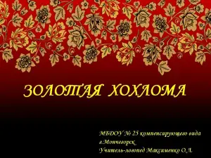 – Золотая хохлома – яркое, самобытное явление русского народа декоративно-прикладного искусства. Этот традиционный художественный промысел имеет более чем трёхсотлетнюю историю и является частью жизни русского народа, который всегда славился стремлением наблюдать красоту и создавать её.
