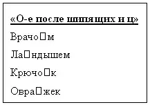 1. На этапе объяснения нового материала необходима наглядность, которая помогает организовать поиск. Например, таблица "О-е после шипящих и ц" (приводятся примеры написания слов, а учащиеся сами формулируют вывод).