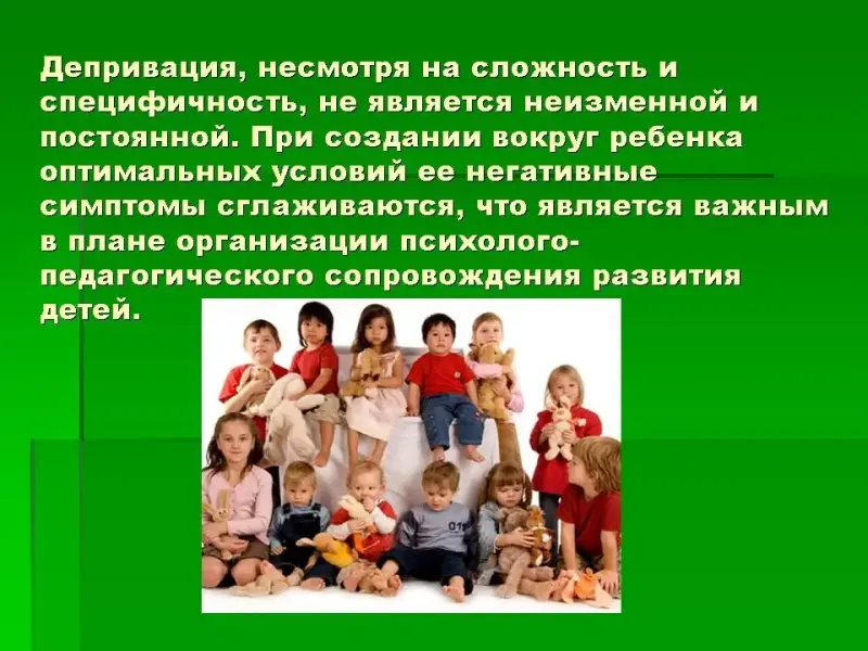 Депривация, несмотря на сложность и специфичность, не является неизменной и постоянной. При создании вокруг ребенка оптимальных условий ее негативные симптомы сглаживаются, что является важным в плане организации психолого-педагогического сопровождения развития детей.