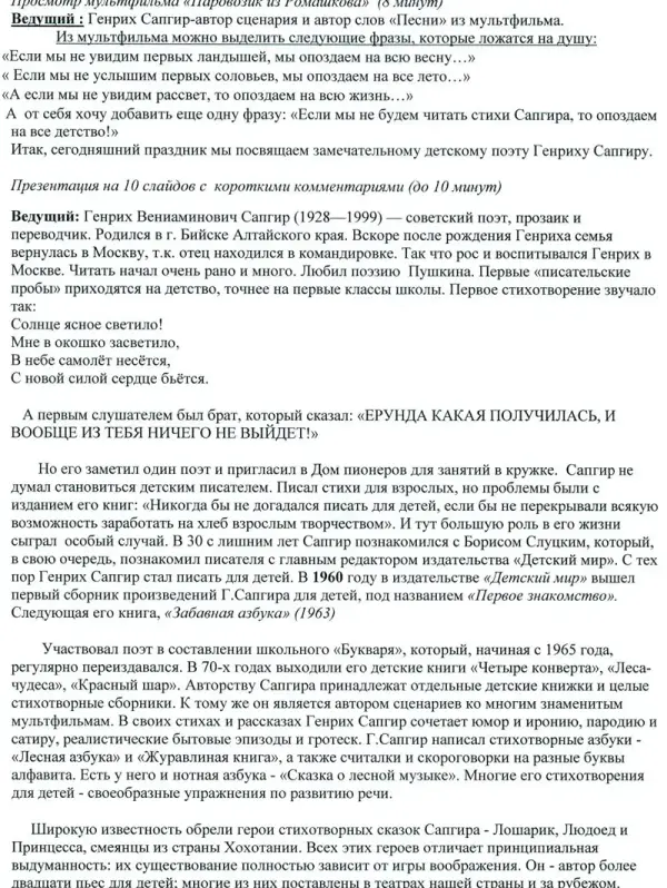 Внеклассное литературно-музыкальное занятие, посвященное поэту Генриху Сапгиру