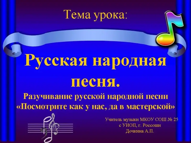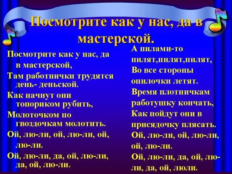 - Разучить и исполнить с учащимися русскую народную песню "Посмотрите как у нас, да в мастерской"