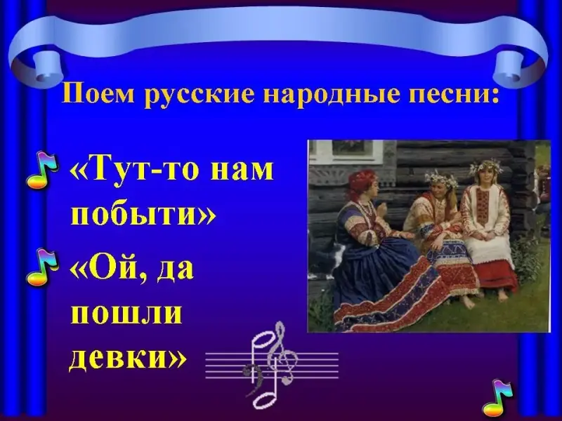 Учитель: Верно, это народные песни, первая называется "Тут-то нам побыти", вторая "Ой, да пошли, девки".