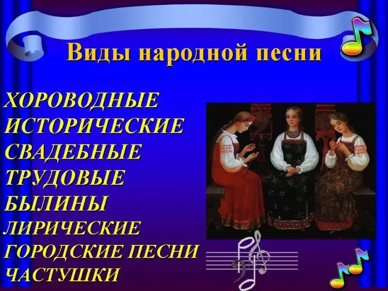 - Какие виды народных песен вы можете назвать?