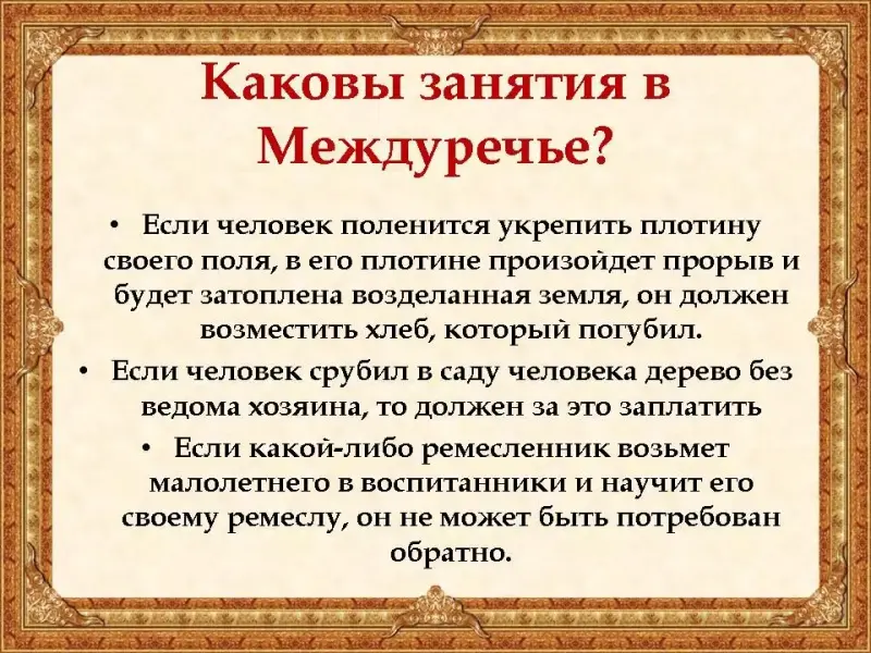 Прочитайте текст из законов Хаммурапи, и составь перечень занятий жителей (либо 1 статья на слайд)