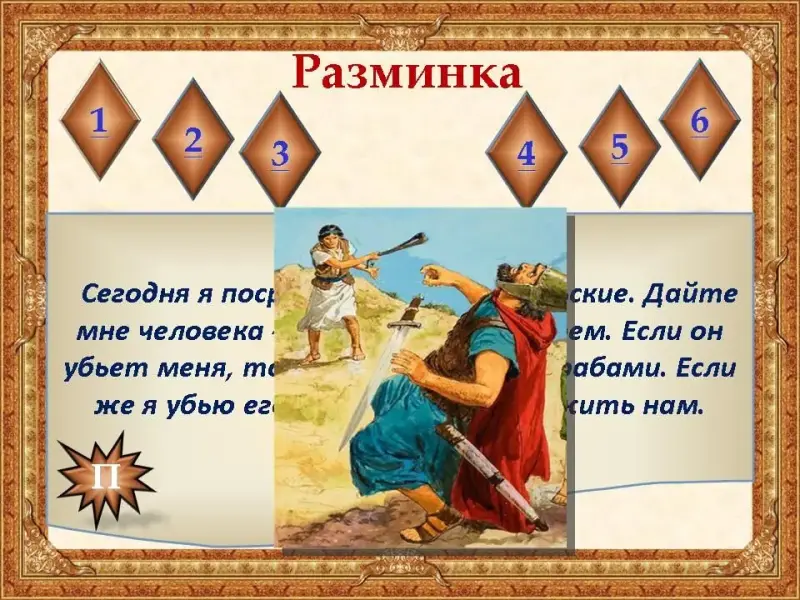 4. Сегодня я посрамлю полки израильские. Дайте мне человека - и мы сразимся вдвоем. Если он убьет меня, то мы будем вашими рабами. Если же я убью его, то вы будете служить нам.