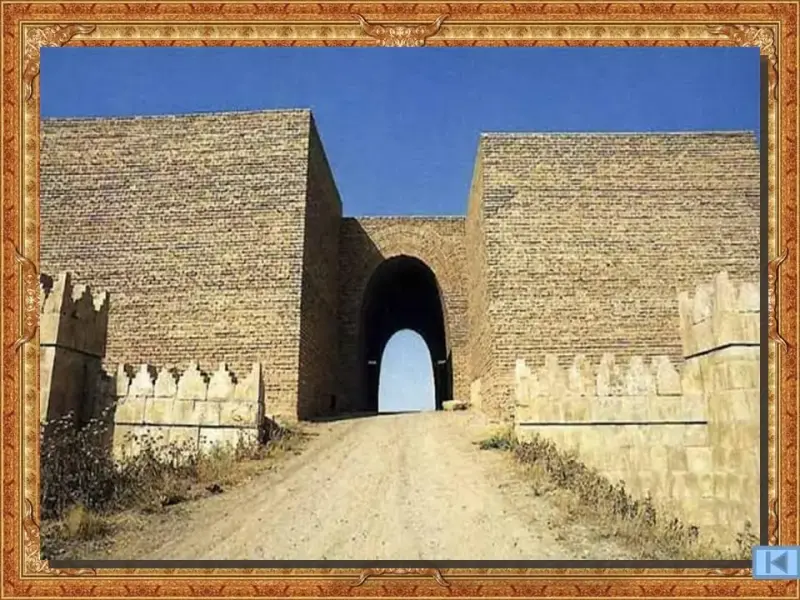 Стена ассирийской столицы необыкновенно крепка, про нее говорили: Та, которая своим ужасным сиянием отбрасывает врагов. Она возвышалась на фундаменте из 4 плит, стоявших по ее углам. В ширину эта стена имела 40 кирпичей (около 10 метров), в высоту - 100 кирпичей (24 метра), в ней было проделано 15 ворот.
