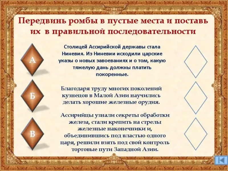 Б. Благодаря труду многих поколений кузнецов в Малой Азии научились делать хорошие железные орудия. В. Ассирийцы узнали секреты обработки железа, стали крепить на стрелы железные наконечники им, объединившись под властью одного царя, решили взять под свой контроль торговок пути Западной Азии. |