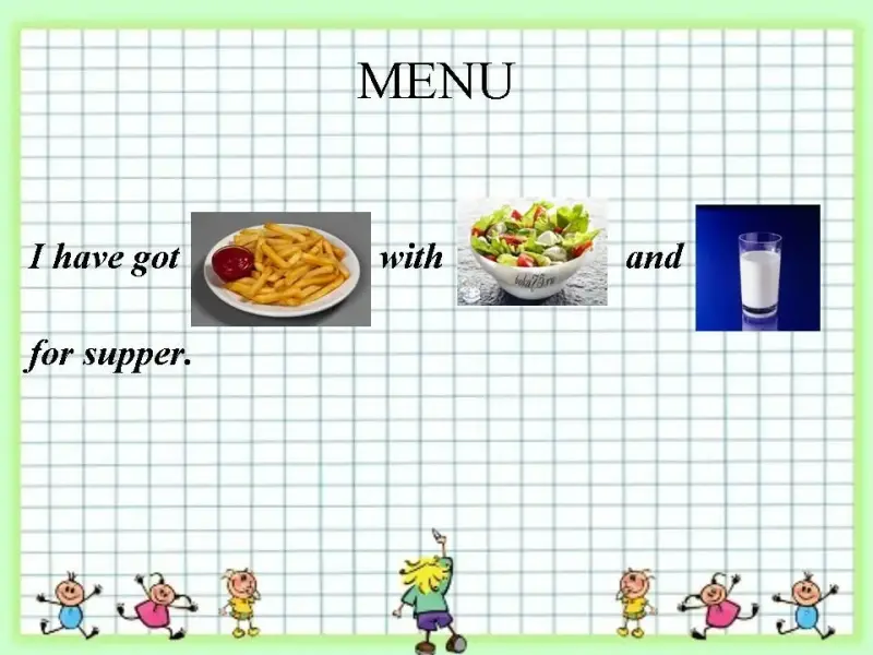 B. Take your "Menu" and put it in front of you. You should tell to the pupils of your team what you usually eat for breakfast, lunch, dinner and supper .Do it one by one. The 1-st pupils begin!