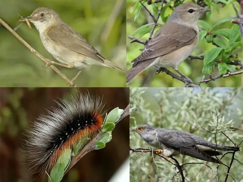 Слайд 5 (анимация - по щелчку появляются кукушка, камышовка, славка, мохнатая гусеница)