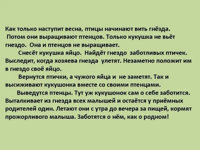Как только наступит весна, птицы начинают вить гнёзда. Потом они выращивают птенцов. Только кукушка не вьёт гнездо. Она и птенцов не выращивает.