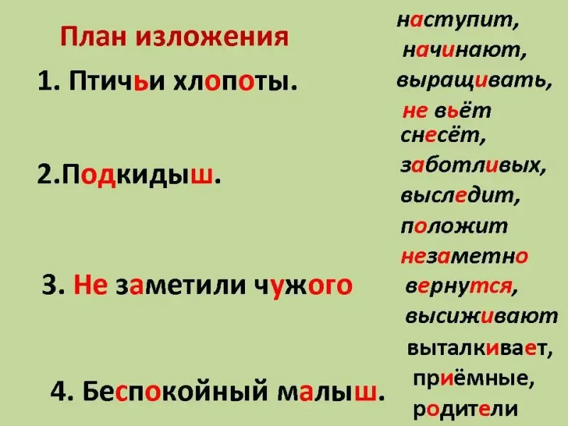 (слова записываются на доске, ученики пользуются ими во время письма изложения)