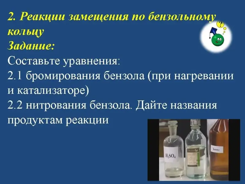 | Объяснение учителя о влиянии заместителей на подвижность атомов водорода в бензольном кольце | Слайд 20 | |