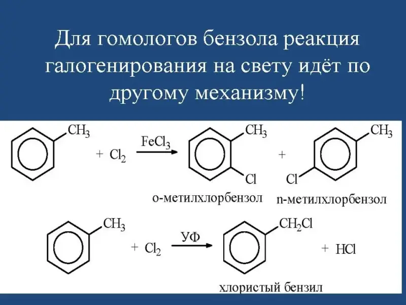| Особенности реакции галогенирования гомологов бензола в зависимости от условий реакции. | Слайд 23 | |