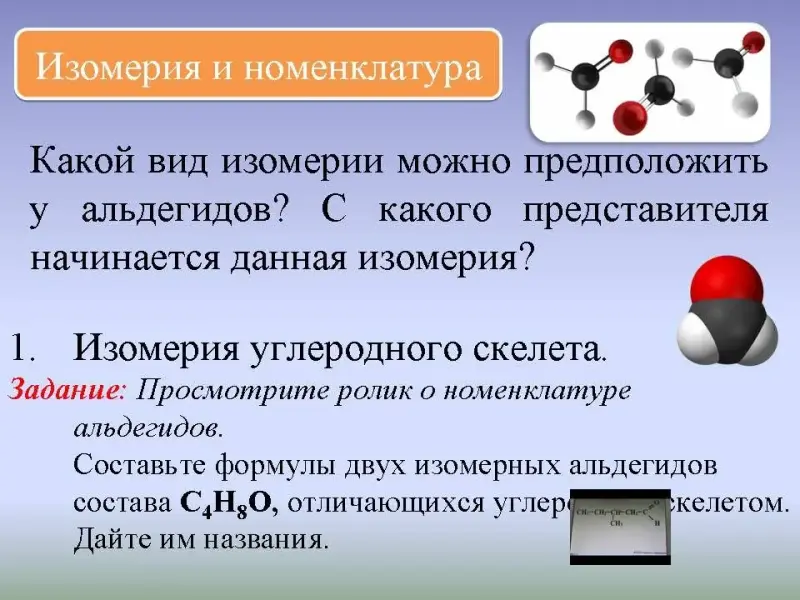 2) познакомить учащихся с многообразием представителей класса альдегидов, актуализируя понятие о различных видах изомерии, совершенствовать умение учащихся составлять названия представленных ими структурных формул органических веществ;