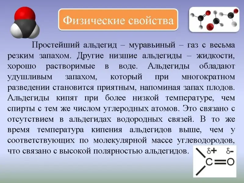| Физические свойства альдегидов. | Объяснение учителя. | Слайд 10 |