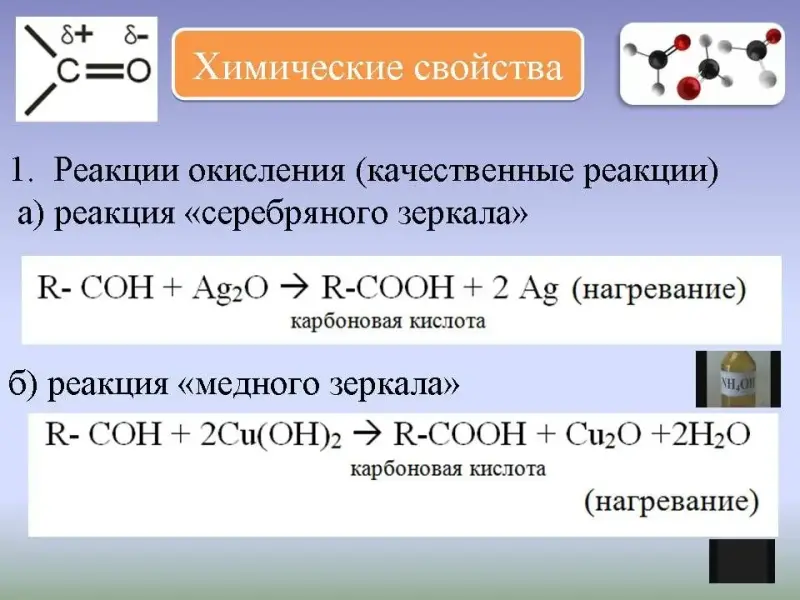 | Химические свойства альдегидов. | Реакции окисления альдегидов (объяснение учителя). Просмотр видеороликов. | Слайд 11 |
