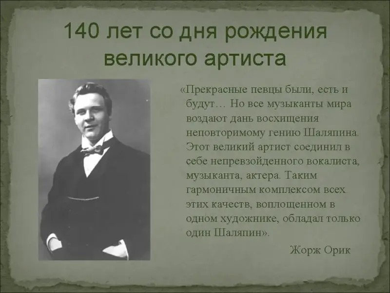 "Прекрасные певцы были, есть и будут… Но все музыканты мира воздают дань восхищения неповторимому гению Шаляпина. Этот великий артист соединил в себе непревзойденного вокалиста, музыканта, актера. Таким гармоничным комплексом всех этих качеств, воплощенном в одном художнике, обладал только один Шаляпин". - писал французский композитор Жорж Орик. (Слайд №3)