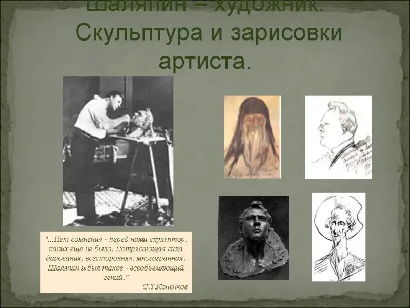 Вообще, Шаляпин обладал множеством талантов. Он был скульптором, рисовальщиком, писал стихи, прозу. "...Нет сомнения - перед нами скульптор, каких еще не было. Потрясающая сила дарования, всесторонняя, многогранная. Шаляпин и был таков - всеобъемлющий гений"- писал о нем известный скульптор С.Т.Коненков. (Слайд №7)