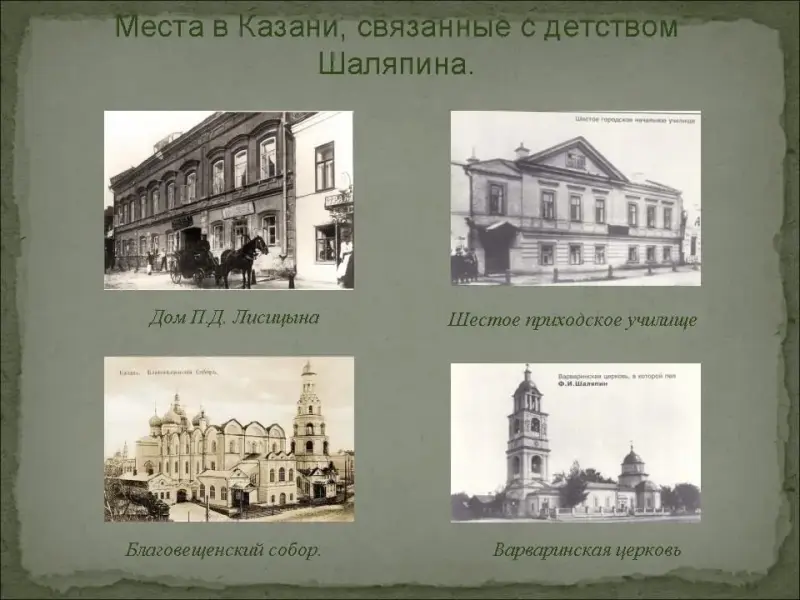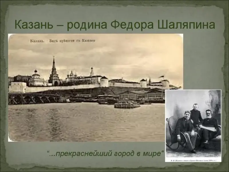Казань - родина самого известного баса Федора Ивановича Шаляпина. Известно, как трепетно и с сыновней любовью относился Шаляпин к родному городу, называя Казань "прекраснейшим городом в мире".(Слайд №8)