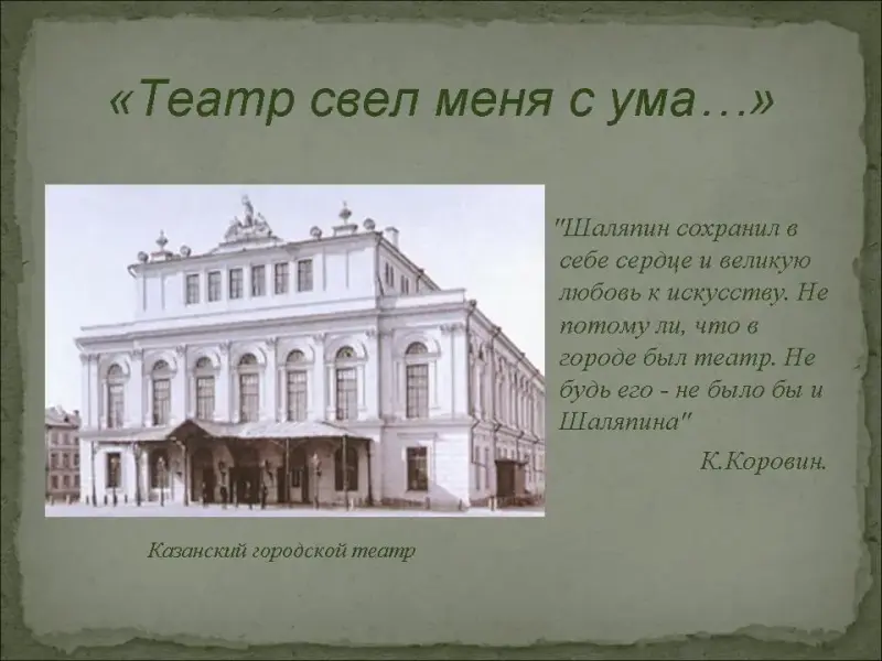 Первые жизненные впечатления Шаляпина были связаны, в основном, с казанскими окраинами, с грязными улицами Суконной слободы, кабаками и трактирами. Но "Шаляпин сохранил в себе сердце и великую любовь к искусству. Не потому ли, что в городе был театр. Не будь его - не было бы и Шаляпина", - писал друг Ф.Шаляпина, художник К.Коровин. В центре Казани находился один из лучших провинциальных театров в России. С тех пор Шаляпина неудержимо тянуло в театр. "Театр свел меня с ума…" - впоследствии вспоминал певец. (Слайд №10)