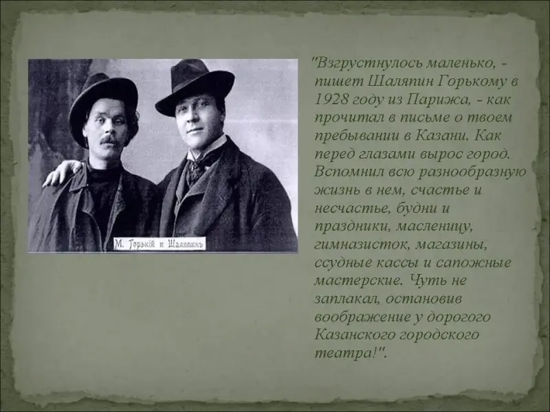 "Взгрустнулось маленько, - пишет Шаляпин Горькому в 1928 году из Парижа, - как прочитал в письме о твоем пребывании в Казани. Как перед глазами вырос город. Вспомнил всю разнообразную жизнь в нем, счастье и несчастье, будни и праздники, масленицу, гимназисток, магазины, ссудные кассы и сапожные мастерские. Чуть не заплакал, остановив воображение у дорогого Казанского городского театра!". (Слайд №15)