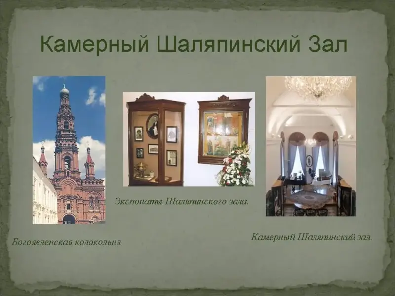 Скульптурная композиция памятника с церковью Богоявления, где был крещен Шаляпин, Камерный шаляпинский зал, расположившийся в Богоявленской колокольне - все это образует единый историко-культурный комплекс, увековечивающий имя гениального сына России - Федора Ивановича Шаляпина. (Слайд №19)