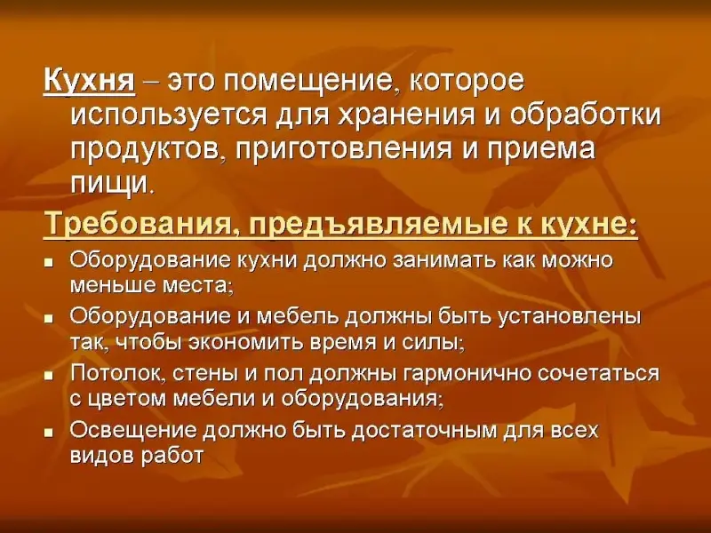 Требования, предъявляемые к кухне: