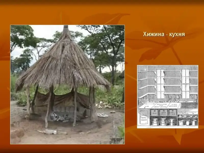 Кухня - это помещение, которое используется для хранения и обработки продуктов, приготовления и приема пищи. Кухня- то жизненное пространство, где собирается все, где не только вкушается пища, но и обсуждаются новости, за утренним завтраком строятся планы нового дня, а вечером высказываются все наболевшее за день…Словом кухня - наш семейный клуб. Именно поэтому мы так хотим, чтобы в ней было уютно, комфортно, а интерьер радовал глаз. Поэтому стремление к созданию уюта формировался в нашем сознании еще в древние времена. Оно присуще человеку, в каких географических и социальных условиях он не жил. Взгляните на хижину (Слайд № 5). При всей убогости убранства чувствуется, что хозяйка поддерживает в ней чистоту и порядок, продумывает расположение предметов.