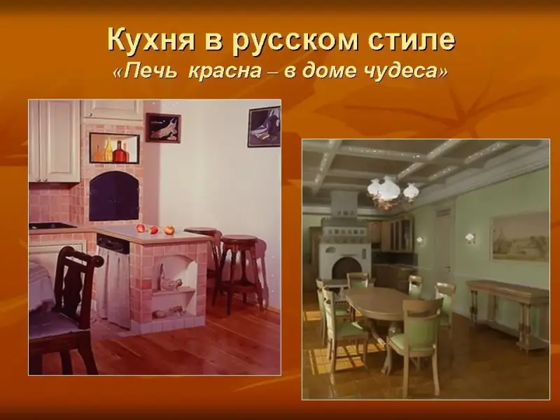 Для оформления кухни можно подобрать любой стиль. Сегодня мы поговорим о кухне в русском стиле. Ведь русские люди считают кухню самым главным помещением в своем доме или квартире. Поэтому, оформление и интерьер кухни в русском стиле состоит абсолютно не в том, чтобы правильно выбрать обои или другие предметы интерьера, а в том, чтобы, как можно точнее создать уютную и тепловую обстановку, характерную только для русских кухонь. Одним из основных убранств кухни является русская печь. Какую роль играла печь в жизни крестьянской семьи? Она была основой жизни, главным оберегом семьи, семейным очагом. Печь кормила, спасала от холода, избавляла от хвори. А сколько сказок было рассказано детям на печи! Недаром говориться: "Печь красна - в доме чудеса! (Слайд № 6)