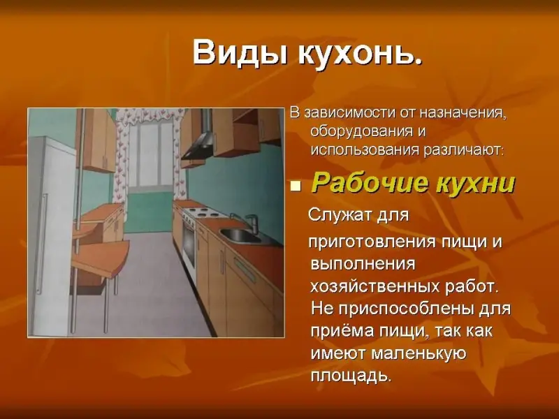 - Служат для приготовления пищи и выполнения хозяйственных работ. Не приспособлены для приёма пищи, так как имеют маленькую площадь.