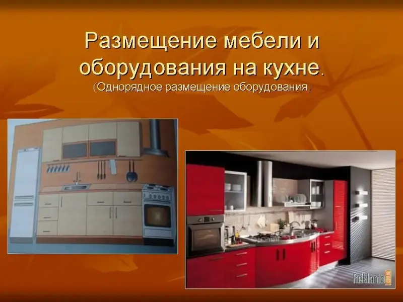 Однорядное размещение мебели и оборудования применяется в маленьких кухнях, в кухнях - нишах. (Слайд №11)