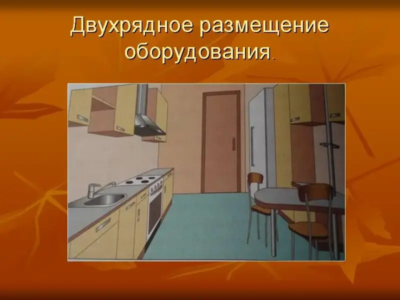 Двухрядное - мебель и оборудование размещаются вдоль двух противоположных стен. Рекомендуется для вытянутых, удлиненных помещений. (Слайд №12)