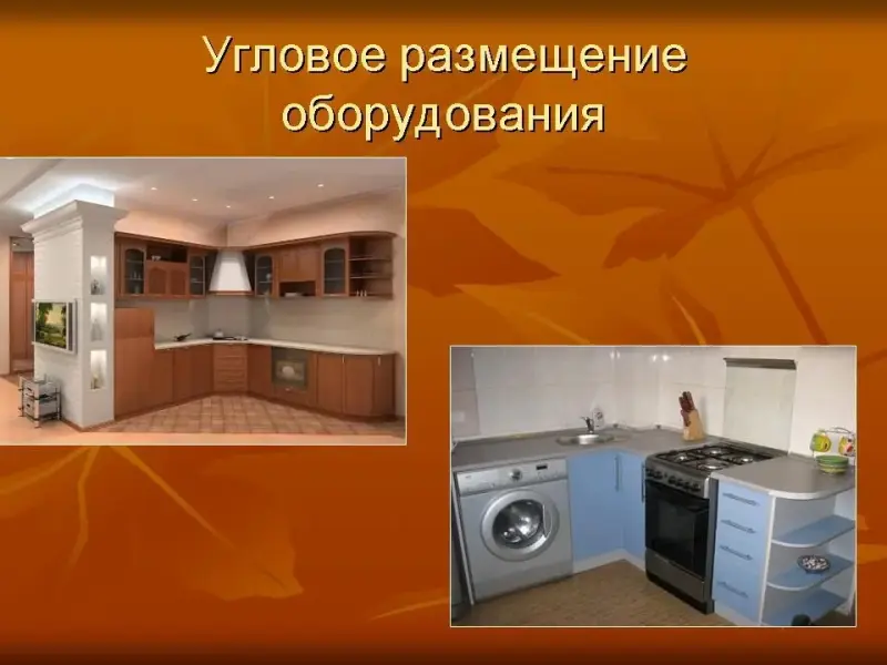Угловое - для узких помещений. Позволяет рационально разместить оборудование и обеденный стол. (Слайд №13)